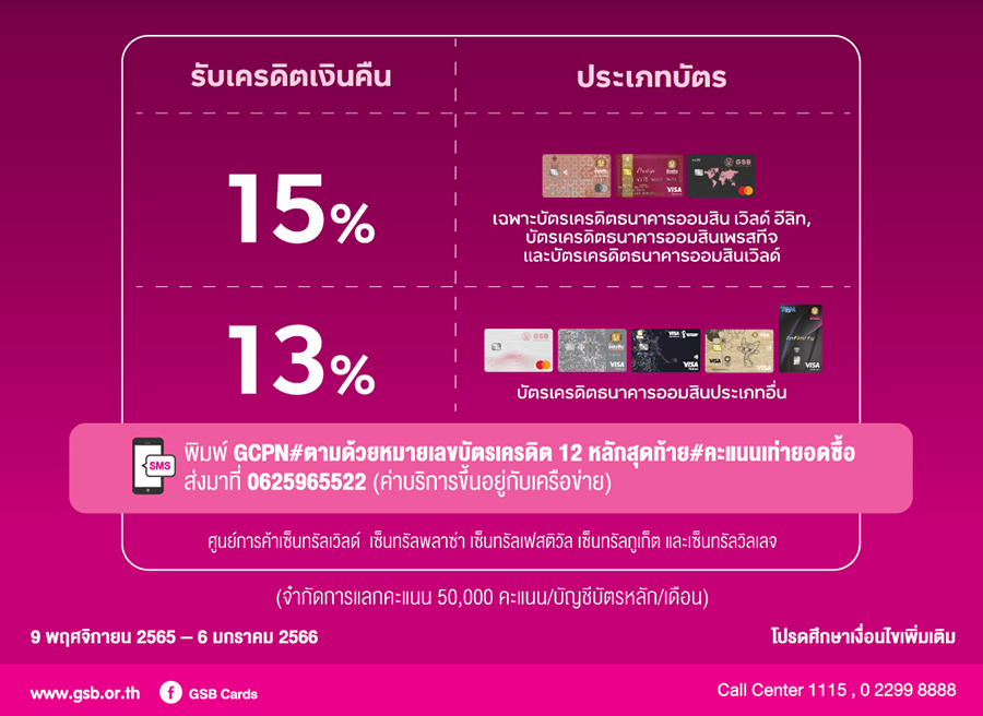 สอบถามเพิ่มเติมได้ที่ GSB Call Center โทร. 1115 หรือ GSB Credit Card Call Center โทร. 02 299 8888