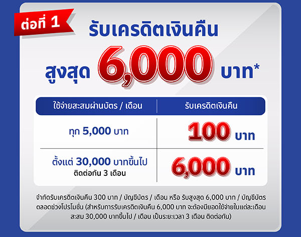 - ต่อที่ 1 ใช้จ่ายสะสมผ่านบัตรทุก 5,000 บาท ขึ้นไป / เดือน รับเครดิตเงินคืน 100 บาท จำกัดรับเครดิตเงินคืน 300 บาท / บัญชีบัตร / เดือน หรือ 900 บาท/ บัญชีบัตร ตลอดช่วงโปรโมชั่น หรือ ใช้จ่ายสะสมผ่านบัตรตั้งแต่ 30,000 บาท /เดือน เป็นระยะเวลา 3 เดือน ติดต่อกัน รับเครดิตเงินคืน 6,000 บาท/ บัญชีบัตร ตลอดช่วงโปรโมชั่น ทั้งนี้ หากเดือนใดเดือนหนึ่งใช้จ่ายสะสมไม่ถึง 30,000 บาท จะไม่ได้รับสิทธิ์นี้