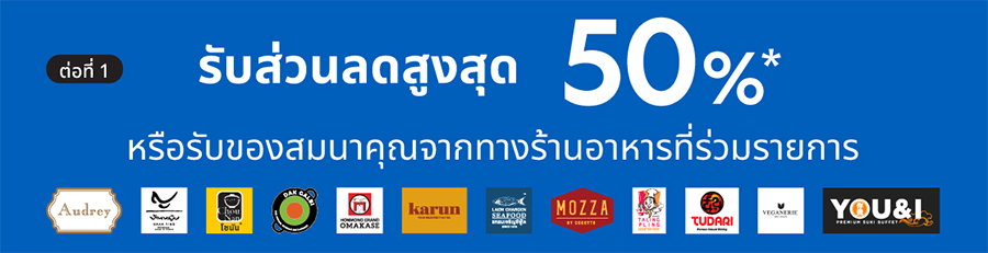 เงื่อนไขต่อที่ 1 ส่วนลดสูงสุด 50% หรือสิทธิพิเศษจากร้านอาหารที่ร่วมรายการ