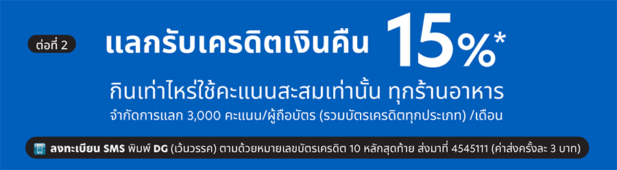 - ผู้ถือบัตรต้องลงทะเบียนผ่าน SMS เพื่อรับเครดิตเงินคืน 15% พิมพ์ DG (เว้นวรรค) ตามด้วยหมายเลขบัตรเครดิต 10 หลักสุดท้าย ส่งมาที่ 4545111 (ค่าส่งครั้งละ 3 บาท) ลงทะเบียนเพียงครั้งเดียวตลอดรายการ กรณีผู้ถือบัตรหลักหลายใบให้ลงทะเบียนเพียงครั้งเดียวตลอดรายการ