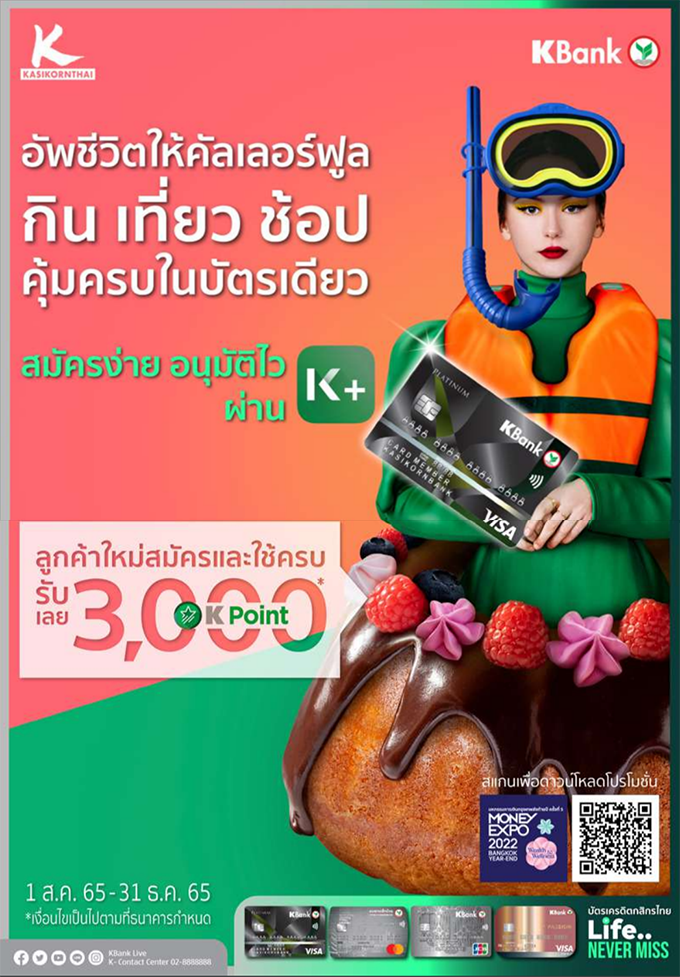บัตรเครดิตกสิกรไทย : อัพชีวิตให้คับเลอร์ฟูล กิน เที่ยว ช้อป คุ้มครบในบัตรเดียว ลูกค้าใหม่สมัคร และใช้ครบ รับเลย 3,000 K Point*