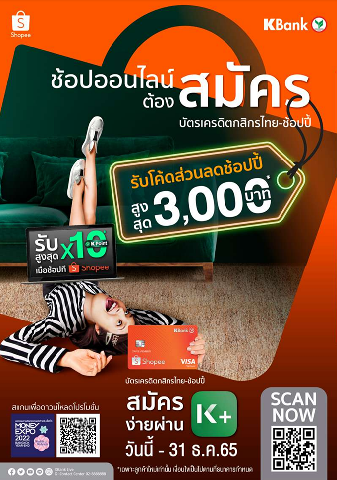 บัตรเครดิตกสิกรไทย-ช้อปปี้ : ช้อปออนไลน์ต้องสมัคร บัตรเครดิตดสิกรไทย-ช้อปปี้ สิทธิพิเศษสำหรับลูกค้าใหม่ รับสูงสุด X10 K Point* เมื่อช้อปที่ Shopee และรับโค้ดส่วนลดช้อปปี้สูงสุด 3,000 บาท* (*เงื่อนไขเป็นไปตามที่ธนาคารกำหนด)