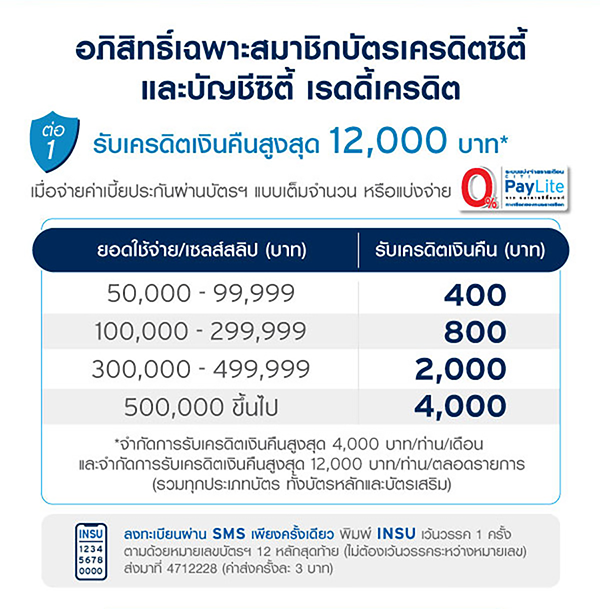 ต่อที่ 1 : รับเครดิตเงินคืนสูงสุด 12,000 บาท เมือจ่ายค่าเบี้ยประกันผ่านบัตรเเบบเต็มจำนวน หรือเเบ่งจ่าย 0% PayLite