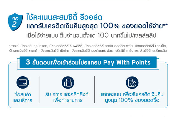 ต่อที่ 2 : ใช้คะเเนนสะสมซิตี้ รีวอร์ด เเลกรับเครดิตเงินคืนสูงสุด 100% ของยอดใช้จ่าย** เมื่อใช้จ่ายเเบบเต็มจำนวนตั้งเเต่ 100 บาทขึ้นไป/เซลล์สลิป