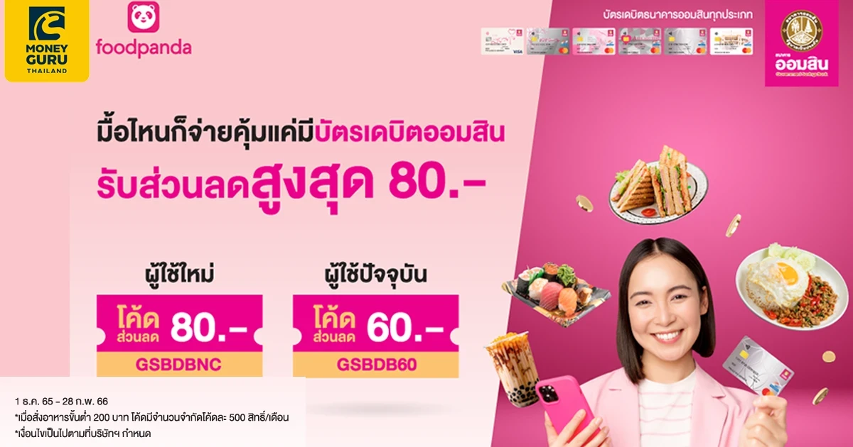 - สิทธิพิเศษเฉพาะผู้ถือบัตรเดบิตธนาคารออมสินทุกประเภท ที่เป็นผู้ใช้ใหม่ของ foodpanda เมื่อสั่งอาหารหรือสินค้าผ่าน foodpanda.co.th หรือแอปพลิเคชัน foodpanda ยอดสั่งตั้งแต่ 200 บาทขึ้นไป/เซลล์สลิป หลังหักค่าส่งและส่วนลดทุกประเภทรับส่วนลด 80 บาท
