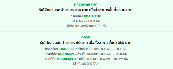 - รับโค้ดส่วนลดค่าอาหาร 100 บาท เมื่อสั่งอาหารขั้นต่ำ 300 บาท กรอกโค้ด KBANKTHU