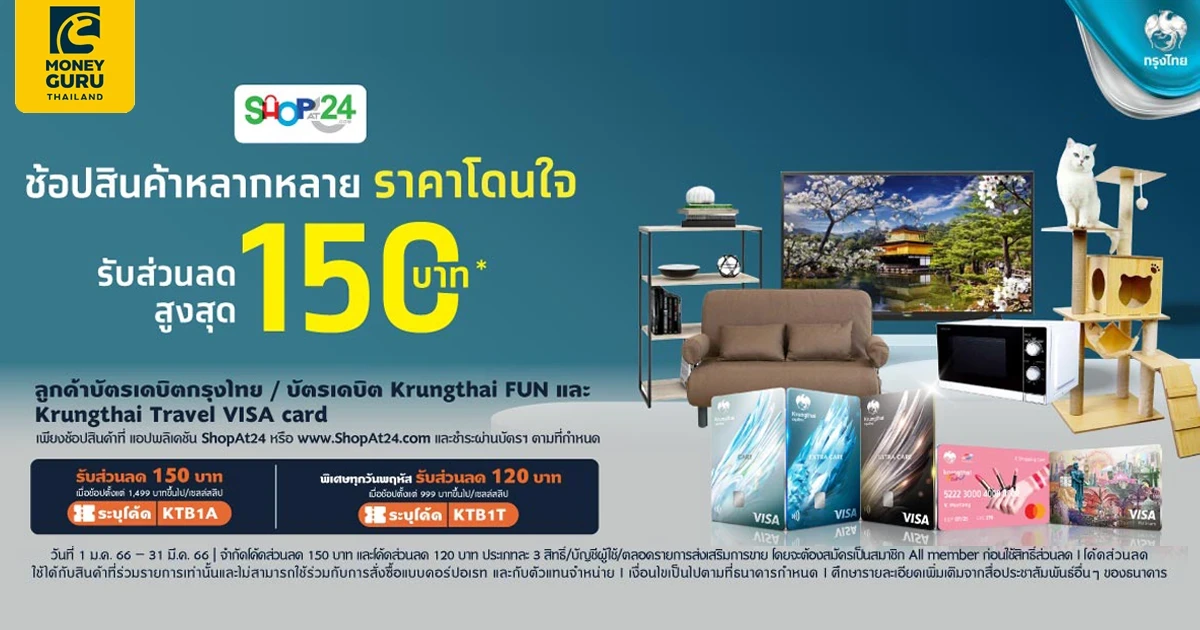 - สิทธิพิเศษสำหรับลูกค้าผู้ถือบัตรเดบิตกรุงไทย, บัตรเดบิต Krungthai FUN และ Krungthai Travel VISA Card ("ลูกค้า") ของธนาคารกรุงไทย จำกัด (มหาชน) ("ธนาคาร") รับส่วนลดพิเศษเมื่อชำระค่าสินค้า หรือบริการด้วยบัตรเดบิตกรุงไทย, บัตรเดบิต Krungthai FUN และ Krungthai Travel VISA Card ("บัตร") ที่ แอปพลิเคชัน ShopAt24 หรือ www.ShopAt24.com ("ร้านค้า") ตั้งแต่วันที่ 1 มกราคม 2566 – 31 มีนาคม 2566 เว้นแต่จะครบตามจำนวนสิทธิ์ก่อนที่จะครบกำหนดระยะเวลาดังกล่าว