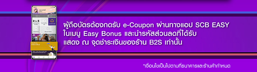 - ผู้ถือบัตรต้องกดรับ e-Coupon ผ่านทางเเอป SCB EASY ในเมนู Easy Bonus เเละนำรหัสส่วนลดที่ได้รับเเสดง ณ จุดชำระเงินของร้าน B2S เท่านั้น