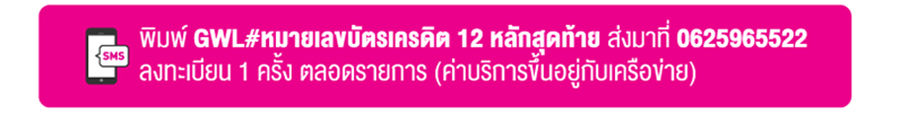 - พิมพ์ GWL# หมายเลขบัตรเครดิต 12 หลักสุดท้าย ส่งมาที่ 0625965522 ลงทะเบียน 1 ครั้ง ตลอดรายการ (ค่าบริการขึ้นอยู่กับเครือข่าย)