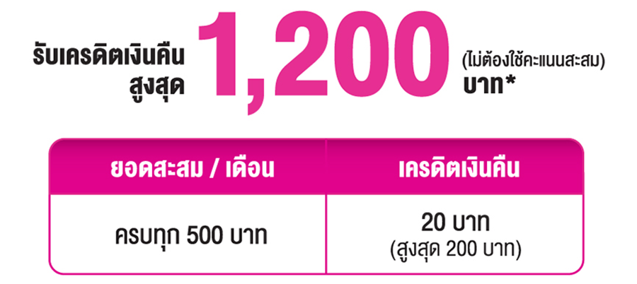 - ยอดสะสม/เดือน ครบทุก 500 บาท รับเครดิตเงินคืน 20 (สูงสุด 200 บาท)