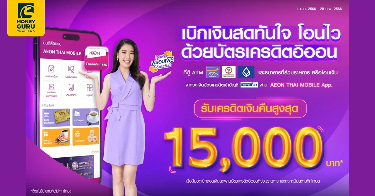 รับเครดิตเงินคืนสูงสุด 15,000 บาท เมื่อสะสมยอดเบิกถอนเงินสดล่วงหน้า และ/หรือมียอดโอนวงเงินบัตรเครดิตเข้าบัญชีพร้อมเพย์ผ่าน AEON THAI MOBILE แอปพลิเคชัน ตามเงื่อนไขที่กำหนด