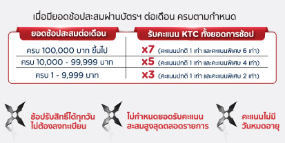 - เคทีซีจะทำการโอนคะแนนพิเศษที่ได้รับตามรายการนี้ เข้าบัญชีบัตรฯ ของสมาชิกภายใน 60 วัน นับจาก วันสุดท้ายของแต่ละเดือนตามรอบปฏิทิน