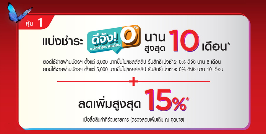 - ยอดใช้จ่ายผ่านบัตรฯ ตั้งแต่ 5,000 บาทขึ้นไป/เซลล์สลิป รับสิทธิ์แบ่งชำระ 0% ดีจัง นาน 10 เดือน