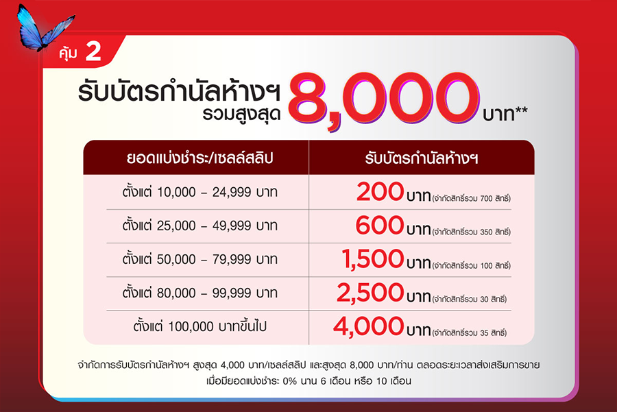 คุ้มที่ 2 รับบัตรกำนัลห้างฯ รวมสูงสุด 8,000 บาท** เมื่อมียอดแบ่งชำระตามเงื่อนไข