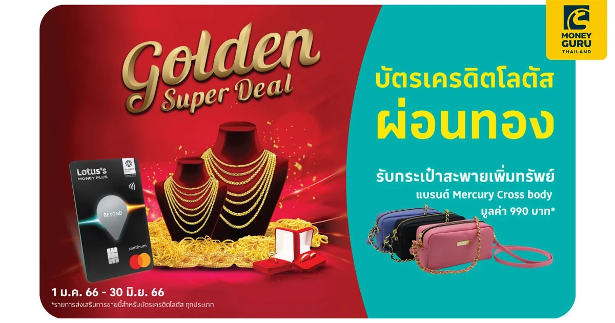 สิทธิพิเศษสำหรับลูกค้าบัตรเครดิตโลตัส เมื่อผ่อนชำระทองรูปพรรณอัตราดอกเบี้ยพิเศษตั้งแต่ 15,000 บาทขึ้นไป/ เซลล์สลิป และนานตั้งแต่ 6 เดือนขึ้นไปรับกระเป๋าสะพายเพิ่มทรัพย์ แบรนด์ Mercury Cross body มูลค่า 990 บาท (*จำกัดการให้ของสมนาคุณ 1 ใบ/ เซลล์สลิป /หมายเลขบัญชีบัตรหลัก /เดือน)