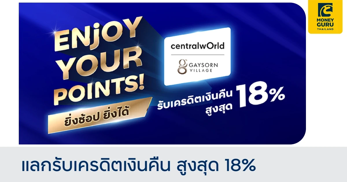 Enjoy Your Points! ยิ่งช้อป ยิ่งได้ รับเครดิตเงินคืนสูงสุด 18%* เมื่อช้อปที่ศูนย์การค้า Central World และ Gaysorn Village และใช้คะแนนสะสมแลกเท่ายอดใช้จ่าย สำหรับบัตรเครดิตประเภทที่มีคะแนน
