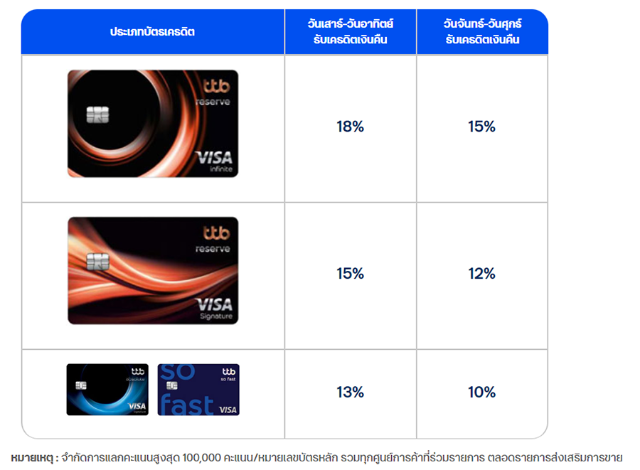 o ประเภทบัตรเครดิต ttb บัตรเครดิตทีเอ็มบี และบัตรเครดิตธนชาตประเภทที่มีคะแนนสะสม รับเครดิตเงินคืน 13% - วันจันทร์-วันศุกร์