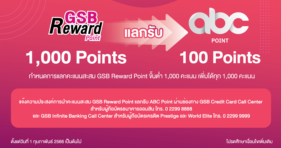 - กำหนดอัตราการแลกคะแนนสะสม GSB Reward Point จำนวน 1,000 คะแนน มีมูลค่าเท่ากับ ABC Point จำนวน 100 คะแนน โดย ABC Point 1 คะแนน มีมูลค่าเท่ากับ 1 บาท