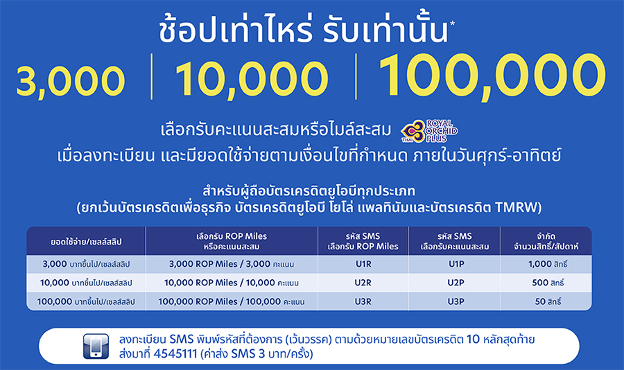รับไมล์สะสม รอยัล ออร์คิด พลัส (ROP Miles) สูงสุด 100,000 ROP Miles หรือคะแนนสะสม UOB Rewards Plus สูงสุด 100,000 คะแนน เมื่อมียอดใช้จ่ายต่อเซลส์สลิปผ่านบัตรเครดิตยูโอบีในวันศุกร์ – อาทิตย์ ตามเงื่อนไขที่กำหนดภายในห้างสรรพสินค้าเดอะมอลล์ ทุกสาขา (รวมสปอร์ตมอลล์, พาวเวอร์ มอลล์, โฮมเฟรชมาร์ท และ กูร์เมต์ มาร์เก็ต) ยกเว้นยอดใช้จ่าย ณ ร้านค้าทุกประเภทภายในศูนย์การค้าเดอะมอลล์ ทุกสาขา (โซนพลาซา)