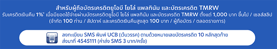 สำหรับผู้ถือบัตรเครดิตยูโอบี โยโล่ แพลทินัม หรือบัตรเครดิต TMRW (จำกัด 100 ท่าน / สัปดาห์)