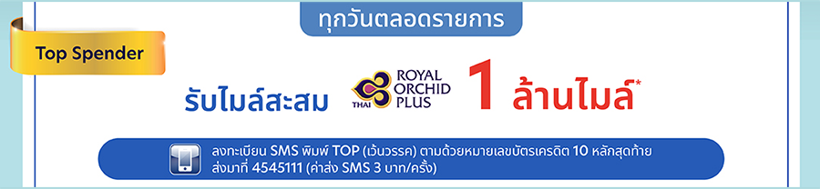 - ยอดใช้จ่ายที่นำมาคำนวณในรายการส่งเสริมการขายนี้ธนาคารจะไม่นับรวมยอดใช้จ่ายที่เกินกว่าวงเงินที่ได้รับอนุมัติจากธนาคาร เมื่อผู้ถือบัตรขอใช้เกินกว่าวงเงินสำหรับแต่ละบัตรเครดิต ถึงแม้ว่าผู้ถือบัตรจะชำระเงินเข้าบัญชีบัตรเครดิตเพื่อรองรับค่าใช้จ่ายในส่วนที่เกินกว่าวงเงินบัตรเครดิตที่ได้รับอนุมัติก็ตาม