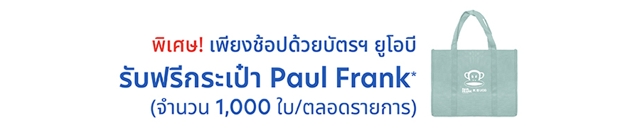 รับฟรี กระเป๋า Paul Frank มูลค่า 190 บาท เมื่อแสดงเซลส์สลิปที่มียอดใช้จ่ายผ่านบัตรเครดิตยูโอบี หรือ บัตรเครดิต TMRW ที่ห้างสรรพสินค้าเดอะมอลล์ ทุกสาขา (รวมสปอร์ตมอลล์, พาวเวอร์ มอลล์, โฮมเฟรชมาร์ท และ กูร์เมต์ มาร์เก็ต) ภายในวันเดียวกับที่มารับของสมนาคุณ