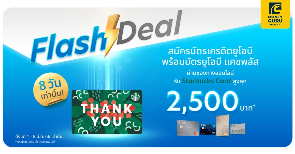 สิทธิพิเศษสำหรับผู้สมัครบัตรเครดิตยูโอบี พร้อมบัตรยูโอบีแคชพลัส ผ่านช่องทางออนไลน์ ระหว่างวันที่ 1 - 8 มี.ค. 66 รับบัตรกำนัลสตาร์บัคส์สูงสุด 2,500 บาท*