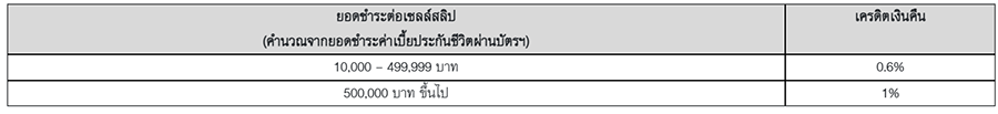 ต่อที่ 1 : รับเครดิตเงินคืน สูงสุด 1% ไม่จำกัดจำนวนเครดิตเงินคืน เพียงลงทะเบียนผ่านทาง SMS ก่อน/ภายในวันเดียวกับวันที่ทำรายการชำระค่าเบี้ยประกัน โดยลงทะเบียนครั้งเดียวสามารถรับสิทธิ์ตลอดรายการ ซึ่งสมาชิกบัตร จะได้รับเครดิตเงินคืนตามเงื่อนไขยอดการใช้จ่าย ดังนี้
