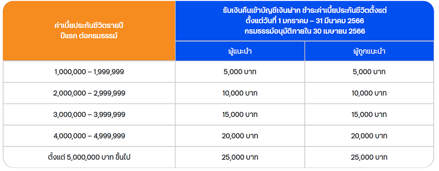 ต่อที่ 2 ผู้แนะนำ (คุณ) และผู้ถูกแนะนำ (เพื่อน) รับเงินคืนสูงสุด 25,000 บาท ต่อท่าน โปรโมชันนี้ไม่รวมผลิตภัณฑ์ประกันชีวิตควบการลงทุน (Unit Linked) และ ผลิตภัณฑ์ประกันชีวิตเพื่อคุ้มครองวงเงินสินเชื่อ