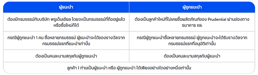 ส่งต่อเอกสิทธิ์พิเศษ เหนือระดับ เพียงชวนเพื่อนมาซื้อผลิตภัณฑ์ประกันชีวิตและสุขภาพจากพรูเด็นเชียล ประกันชีวิตที่ร่วมรายการชำระเบี้ยประกันภัย ตั้งแต่ 1 ล้านบาทขึ้นไป
