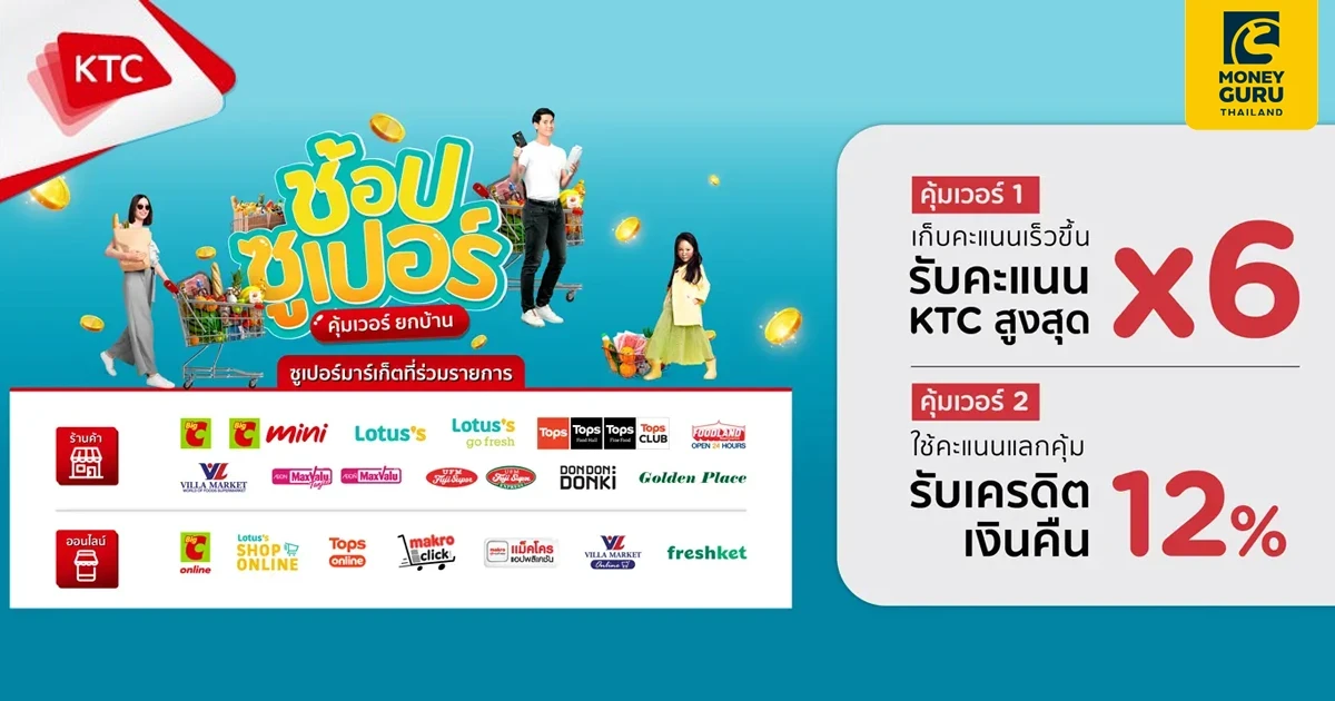 - รายการส่งเสริมการขาย ("รายการ") นี้ บริษัท บัตรกรุงไทย จำกัด (มหาชน) หรือ เคทีซี จัดทำขึ้นเพื่อมอบสิทธิประโยชน์เครดิตเงินคืนให้แก่สมาชิกบัตรเครดิต KTC ("สมาชิก") ที่มีคะแนน KTC FOREVER ("คะแนน") และมียอดใช้จ่ายผ่านบัตรเครดิต KTC ("บัตรฯ") ณ ทุกร้านค้าในหมวด Supermarket ภายใต้ MCC Code: 5333 และ 5411 ในช่วงระหว่างวันที่ 1 ก.พ. 66 – 30 เม.ย. 66 (“ระยะเวลารายการ”) ตามเงื่อนไขที่กำหนดเท่านั้น