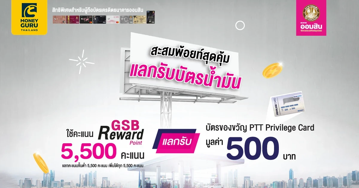 สิทธิพิเศษสำหรับผู้ถือบัตรเครดิตธนาคารออมสิน ใช้คะแนนสะสม GSB Reward Point 5,500 คะแนน แลกรับบัตรของขวัญ PTT Privilege Card มูลค่า 500 บาท (แลกคะแนนขั้นต่ำ 5,500 คะแนน เพิ่มได้ทุก 5,500 คะแนน)