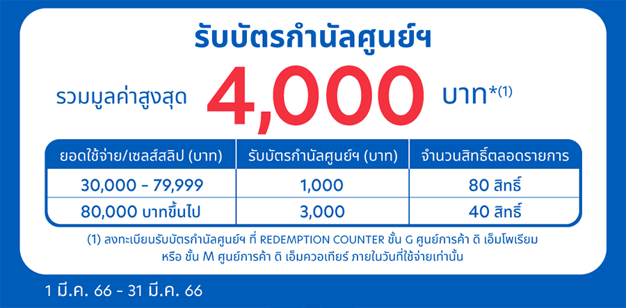 รับบัตรกำนัลศูนย์ฯ รวมมูลค่าสูงสุด 4,000 บาท* เมื่อมียอดใช้จ่ายสะสมตามเงื่อนไข
