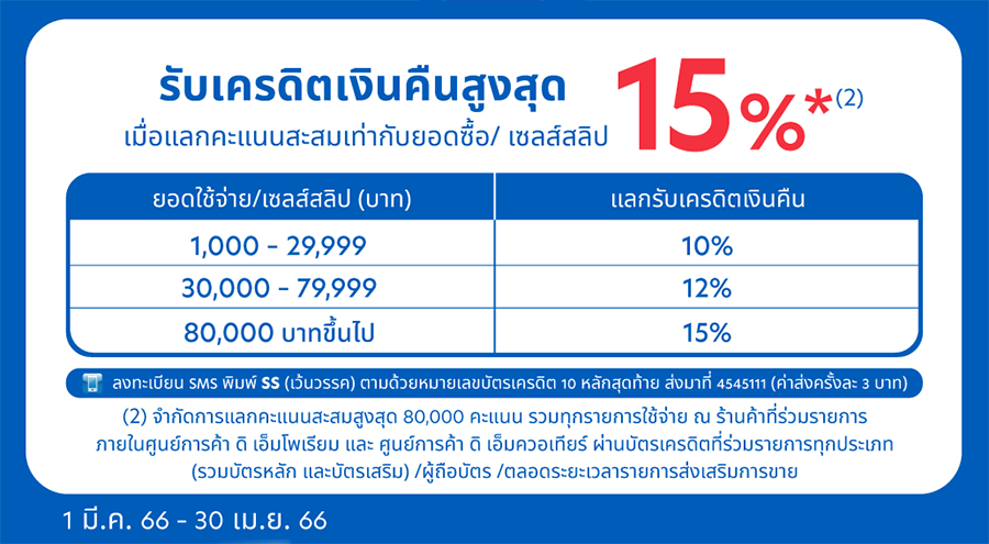 รับเครดิตเงินคืนสูงสุด 15% เมื่อแลกคะแนนสะสมเท่ากับยอดซื้อ/เซลล์สลิป