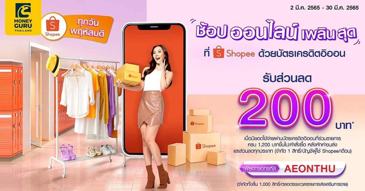 ช้อปออนไลน์ เพลินสุดที่ Shopee ด้วยบัตรเครดิตอิออน รับส่วนลด 200 บาท* เมื่อมียอดใช้จ่ายผ่านบัตรเครดิตอิออนที่่ร่วมรายการครบ 1,200 บาทขึ้นไป/คำสั่งซื้อ หลังหักค่าขนส่ง และส่วนลดทุกประเภท (จำกัด 1 สิทธิ์/บัญชีผู้ใช้ Shopee /เดือน) เพียงกรอกรหัส AEONTHU (จำกัดทั้งสิ้น 1,000 สิทธิ์/ตลอดระยะเวลารายการส่งเสริมการขาย)