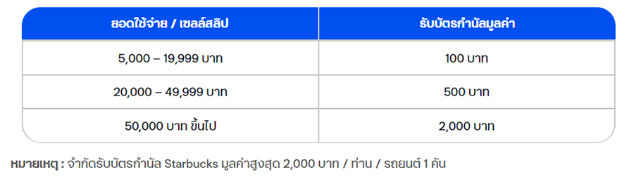 - บัตรกำนัล Starbucks ใบละ 500 บาท จำกัด 70 ใบ หรือรวมมูลค่า 35,000 บาทตลอดรายการ