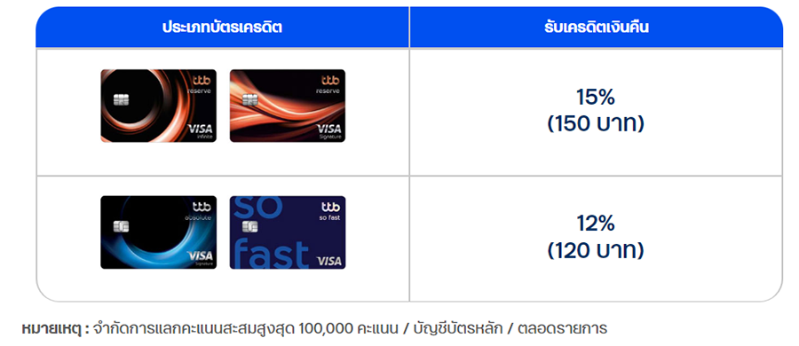- ใช้คะแนนสะสม ttb rewards ทุกๆ 1,000 คะแนน และต้องไม่เกินยอดใช้จ่าย แลกรับเครดิตเงินคืน สำหรับบัตรเครดิต ttb reserve infinite และ บัตรเครดิต ttb reserve signature รับเครดิตเงินคืน 150 บาท และสำหรับบัตรเครดิต ttb บัตรเครดิตทีเอ็มบี และบัตรเครดิตธนชาต ประเภทที่มีคะแนนสะสม รับเครดิตเงินคืน 120 บาท โดยจำกัดการแลกคะแนนสะสมสูงสุด 100,000 คะแนน / บัญชีบัตรหลัก / ตลอดรายการส่งเสริมการขาย ทั้งนี้การแลกคะแนนสะสมต้องไม่เกินยอดใช้จ่ายต่อเซลล์สลิป โดยมียอดใช้จ่ายขั้นต่ำ 1,000 บาทขึ้นไป / เซลล์สลิป ระบบจะคำนวณเฉพาะบัตรหลักที่มีการลงทะเบียนเท่านั้น