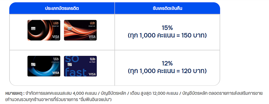 - การแลกคะแนนสะสมรับเครดิตเงินคืนต้องมียอดใช้จ่ายขั้นต่ำ 1,000 บาทขึ้นไป / เซลล์สลิป ที่ ร้านอาหารที่ร่วมรายการเท่านั้น โดยคะแนนสะสมทุก 1,000 คะแนน แลกรับเครดิตเงินคืน 150 บาท สำหรับบัตรเครดิต ttb reserve infinite และบัตรเครดิต ttb reserve signature และ แลกรับเครดิตเงินคืน 120 บาท สำหรับบัตรเครดิต ttb (บัตรเครดิตทีเอ็มบีและบัตรเครดิตธนชาต) ประเภทที่มีคะแนนสะสม โดยจำกัดการแลกคะแนนสะสมเพื่อรับเครดิตเงินคืนสูงสุด 4,000 คะแนน / บัญชีบัตรหลัก / เดือน สูงสุด 12,000 คะแนน / บัญชีบัตรหลัก ตลอดรายการส่งเสริมการขาย ทั้งนี้การแลกคะแนนสะสมแต่ละครั้งต้องไม่เกินยอดใช้จ่ายต่อเซลล์สลิป โดยระบบจะคำนวณเฉพาะบัตรหลักที่มีการลงทะเบียนเท่านั้น