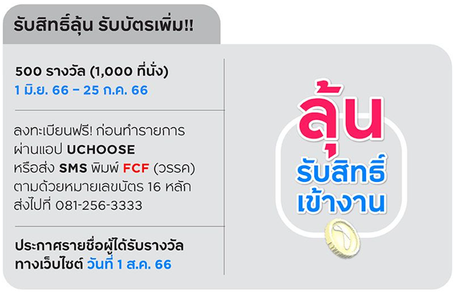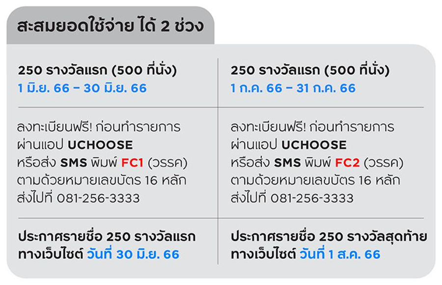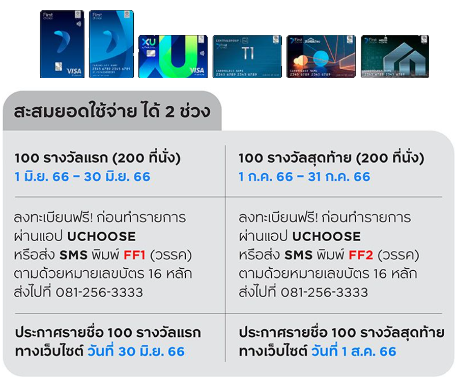 - สมาชิกใหม่ได้รับการอนุมัติ ลงทะเบียน และใช้จ่ายตามเงื่อนไข ตั้งแต่วันที่ 1 มิ.ย. 66 - 30 มิ.ย. 66 (เฉพาะลูกค้าใหม่สมัครบัตรใบแรก ไม่รวมถึงสมาชิกปัจจุบันที่ถือบัตรเฟิร์สช้อยส์หรือยกเลิกบัตรภายใน 12 เดือน) โดยลงทะเบียนก่อนทำรายการผ่าน UCHOOSE หรือ ส่ง SMS พิมพ์ "FF1" (วรรค) ตามด้วยหมายเลขบัตร 16 หลัก ส่งไปที่ 081-256-3333 และต้องมียอดใช้จ่ายสะสมรูดเต็มจำนวน และ / หรือ ผ่อนสินค้า และ / หรือ กดเงินสด ตั้งแต่ 20,000 บาท รับสิทธิ์รับบัตรเข้างาน First Choice Festival จำนวน 1 รางวัล 2 ที่นั่งต่อ 1 หมายเลขบัตรหลัก ตลอดรายการ สำหรับลูกค้าที่ทำตามเงื่อนไขของบริษัทฯ จำกัดจำนวน 100 รางวัล หรือ 200 ที่นั่ง