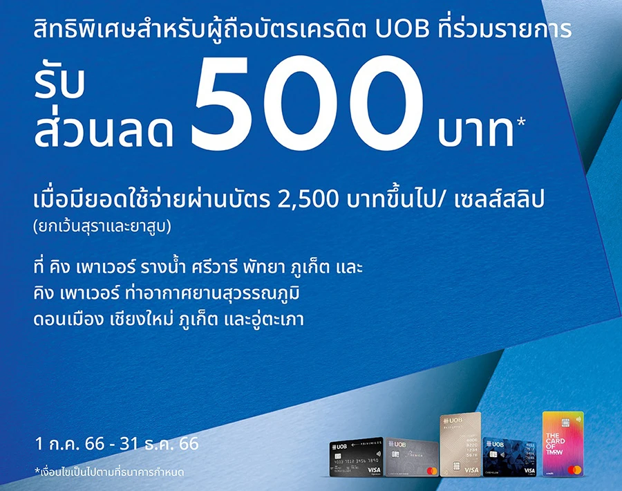 สิทธิพิเศษเฉพาะบัตรเครดิต UOB ที่ร่วมรายการ รับส่วนลด 500 บาท เมื่อช้อปปิ้งผ่านบัตร 2,500 บาทขึ้นไป ที่ คิง เพาเวอร์ รางน้ำ ศรีวารี พัทยา ภูเก็ต และ คิง เพาเวอร์ ท่าอากาศยานสุวรรณภูมิ ดอนเมือง เชียงใหม่ ภูเก็ต และอู่ตะเภา