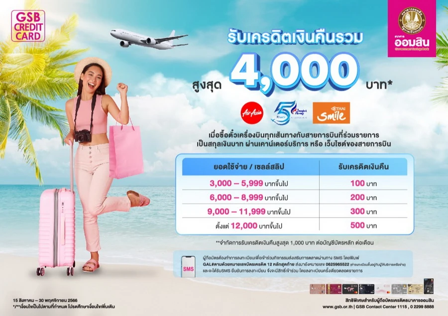 - สิทธิพิเศษสำหรับผู้ถือบัตรเครดิตธนาคารออมสินทุกประเภทที่มียอดใช้จ่ายแบบเต็มจำนวนเป็นสกุลเงินบาท เพื่อซื้อบัตรโดยสารร่วมกับสายการบินที่ร่วมรายการ ผ่านเคาน์เตอร์บริการของสายการบินโดยตรง หรือเว็บไซต์ของสายการบิน ระหว่างวันที่ 15 สิงหาคม – 30 พฤศจิกายน 2566 จะได้รับเครดิตเงินคืนตามรายละเอียดที่กำหนด