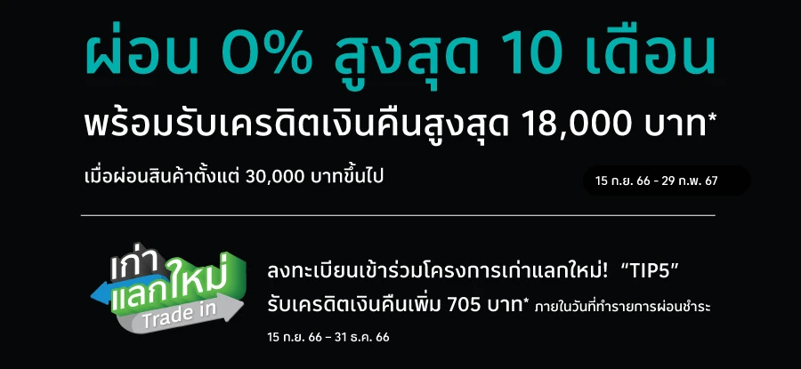 - เมื่อมียอดผ่อนชำระสินค้า iPhone ทุกรุ่น 10 เดือนขึ้นไป ราคาตั้งแต่ 20,000บาทขึ้นไป/เซลล์สลิป ลงทะเบียนเข้าร่วมโครงการ เก่าแลกใหม่ หรือ “TIP5” ผ่านโทรศัพท์มือถือหลังทำรายการผ่อน (จำกัด 1 สิทธิ์ หรือ 1 เครื่อง/หมายเลขบัญชีบัตรหลักตลอดรายการ)