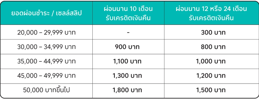 - ยอดเครดิตเงินคืนจะคำนวณยอดแบ่งจ่ายตั้งแต่ 20,000 บาทขึ้นไป/เซลล์สลิปและผ่อนชำระนาน 10 เดือนขึ้นไป