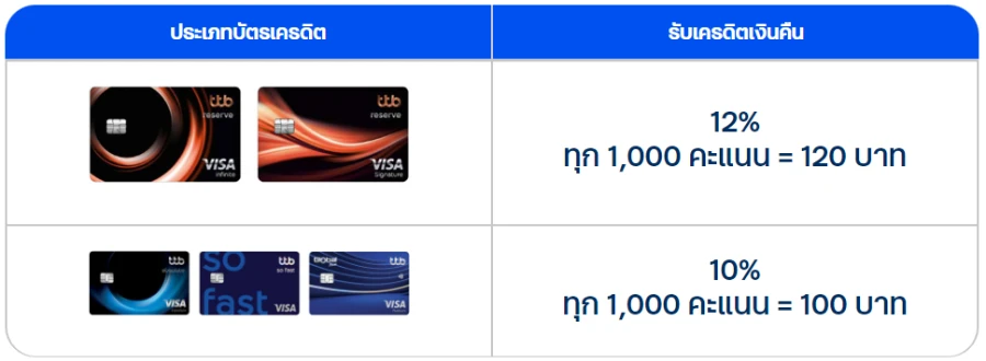 - สำหรับบัตรเครดิต ttb ประเภทอื่นๆ ที่มีคะแนนสะสม รับเครดิตเงินคืน 10% (100 บาท)