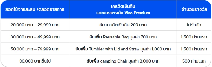 - จำกัดสิทธิ์จากการได้รับเครดิตเงินคืน แลกรับของกำนัล Visa premium และลุ้นรับรางวัลแพ็กเกจ Paris 2024 1 ท่านต่อ 1 สิทธิ์ (ตามหมายเลขบัตรประชาชน) ในกรณีที่ลูกค้ามีการลงทะเบียนและมียอดใช้จ่ายผ่านทั้งบัตรเครดิตและบัตรเดบิต ธนาคารฯ ขอสงวนสิทธิ์ให้สิทธิ์จากบัตรเครดิตหรือบัตรเดบิตที่มียอดใช้จ่ายตามตารางที่กำหนด สูงที่สุดมาคำนวนรับเครดิตเงินคืนและแลกรับของกำนัล Visa premium และลุ้นรับรางวัลแพ็กเกจ Paris 2024