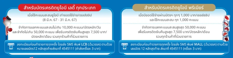 - จำกัดการแลกคะแนนสะสมไม่เกิน 10,000 คะแนน/บัตรหลัก/วัน และจำกัดไม่เกิน 50,000 คะแนน เพื่อรับเครดิตเงินคืนสูงสุด 7,500 บาท/บัตรหลัก/เดือน รวมทุกร้านค้าที่ร่วมรายการ