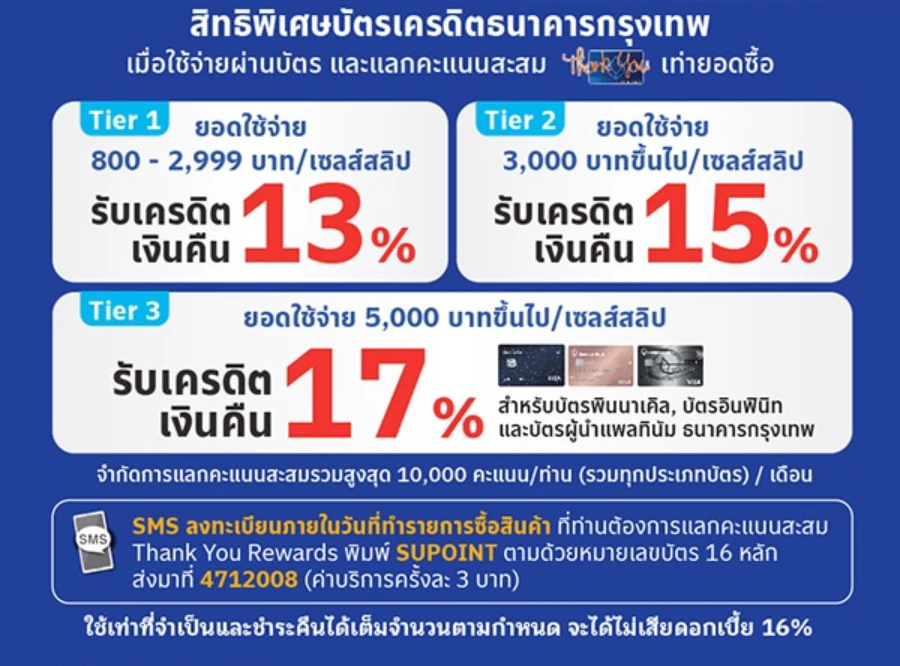 - SMS ลงทะเบียนภายในวันที่ทำรายการซื้อสินค้า ที่ท่านต้องการแลกคะแนนสะสม Thank You Rewards พิมพ์ SUPOINT ตามด้วยหมายเลขบัตร 16 หลัก ส่งมาที่ 4712008 (ค่าบริการครั้งละ 3 บาท), จำกัดการแลกคะแนนสะสม Thank You Rewards รวมสูงสุด 10,000 คะแนน / ท่าน (รวมทุกประเภทบัตร) / เดือน โดยนับรวมยอดใช้จ่ายทุกร้านค้าที่ร่วมรายการ และระบบจะคำนวณเฉพาะบัตรหลักที่มีการลงทะเบียนเท่านั้น