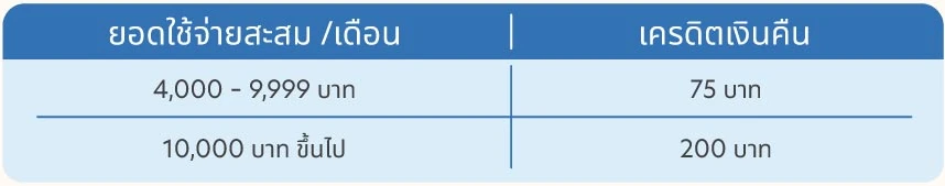 ยอดใช้จ่ายสะสม /เดือน เครดิตเงินคืน 4,000 – 9,999 บาท 75 บาท 10,000 บาท ขึ้นไป 200 บาท - จำกัดเครดิตเงินคืน 200 บาท /เดือน และ 600 บาท/ ลูกค้า ตลอดรายการ