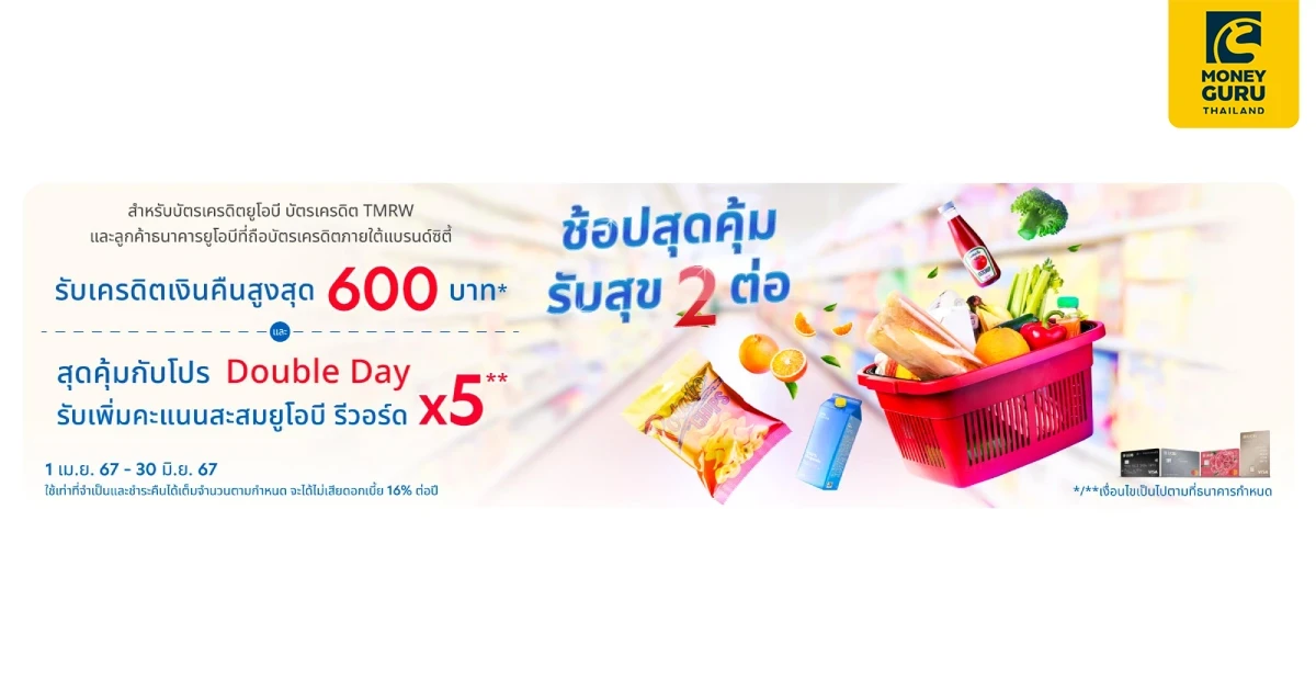 ช้อปสุดคุ้ม รับสุข 2 ต่อ กับบัตรเครดิตยูโอบี รับเครดิตเงินคืนสูงสุด 600 บาท* และรับคะแนนสะสมยูโอบี รีวอร์ด x5** สำหรับบัตรเครดิตยูโอบี บัตรเครดิต TMRW และลูกค้าธนาคารยูโอบีที่ถือบัตรเครดิตภายใต้แบรนด์ซิตี้