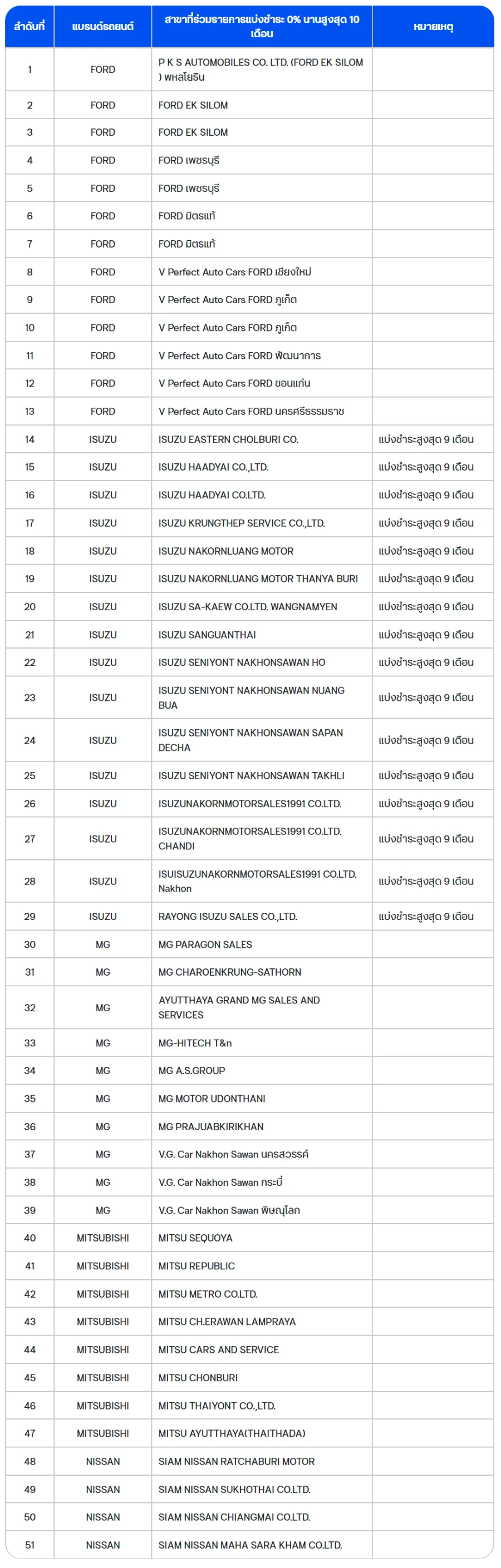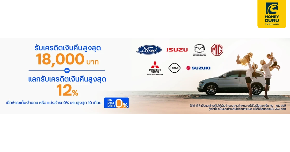 ชำระเต็มจำนวน เมื่อจองรถ หรือดูแลรถยนต์ กับ 7 แบรนด์ชั้นนำ ทุกสาขา ที่ FORD, ISUZU, MAZDA, MG, MITSUBISHI, NISSAN และ SUZUKI หรือแบ่งชำระ 0% นานสูงสุด 10 เดือน กับ 5 แบรนด์ชั้นนำ เฉพาะสาขาที่ร่วมรายการ FORD, ISUZU, MG ,MITSUBISHI และ NISSAN